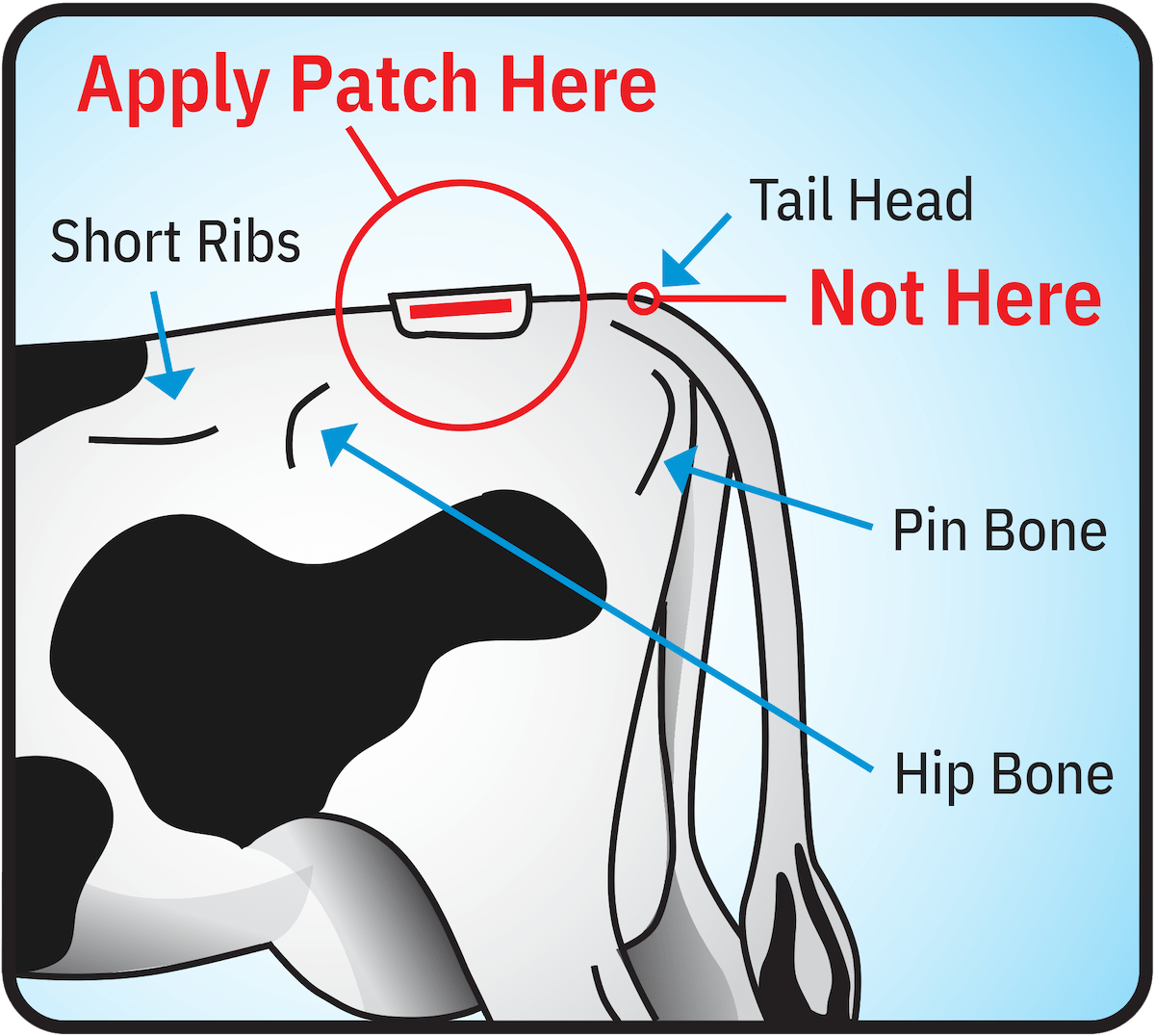 - For an average sized 500kg cow, position the front edge of the heat patch in line with the back of the hip bones as per the illustration. On taller, broader cows the heat patch should be placed closer to the rear (approx. 3cm closer to the tail for every 50kg over the 500kg average).